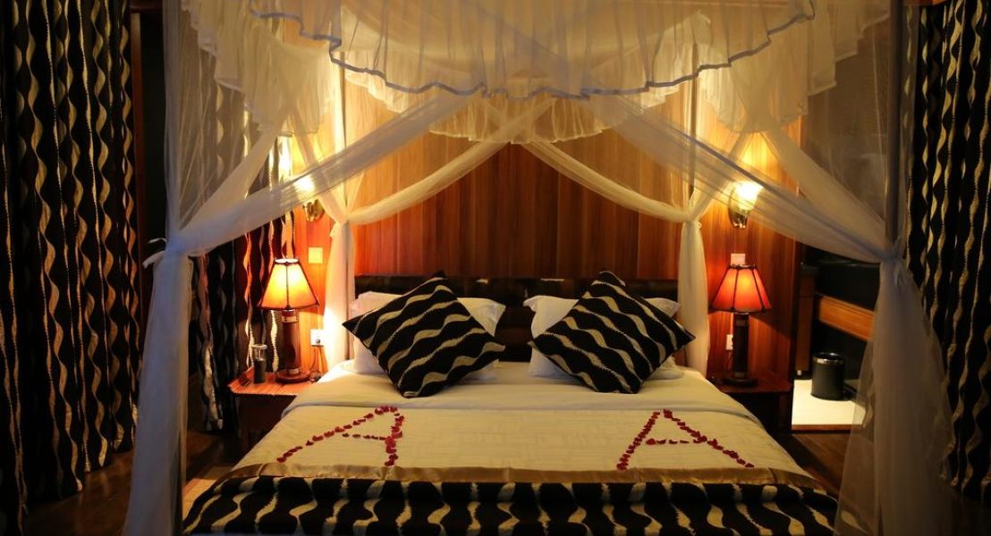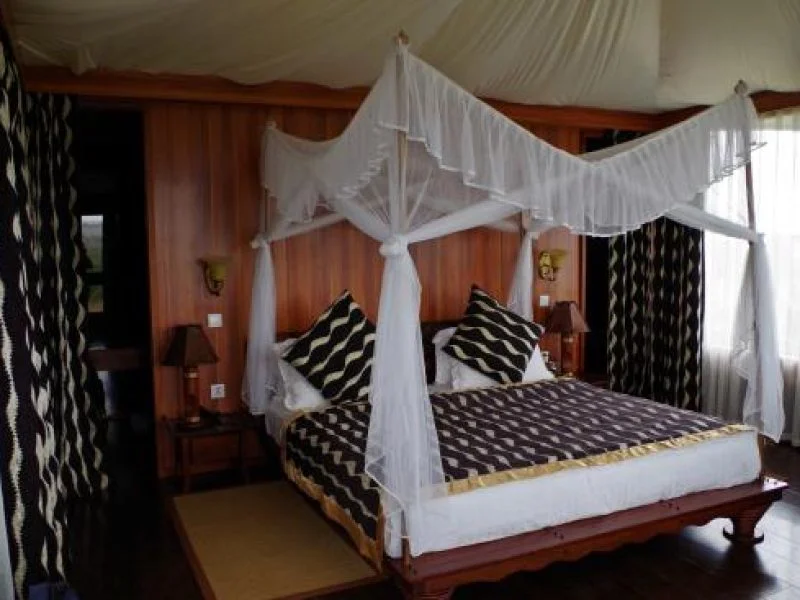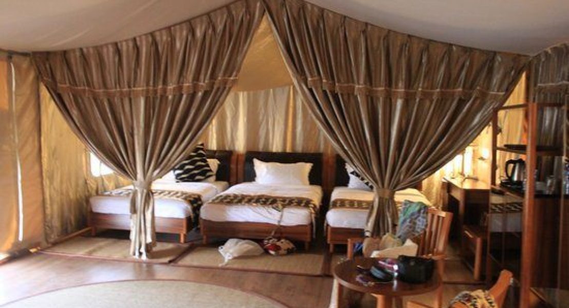 AA Lodge’s modern tents are designed with glass walls which allow natural light into the room, also offering scenic views of the surrounding plain. Each luxurious room is fitted with ornate lamps, wall lights, a work table, sofas, hardwood flooring and beds draped with mosquito netting.